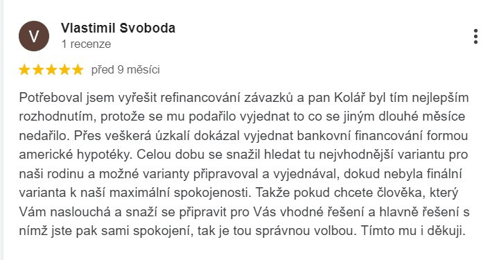 Potřeboval jsem financování pro svůj podnikatelský záměr, všechny známé banky se mé žádosti stavěly negativně, pan Kolář dokázal / zařídil alternativní financování (financování u Oberbank). Oproti jiným bankám u posouzení proběhlo ve velmi krátkém čase a vše proběhlo k mé spokojenosti. Naprostá spokojenost s panem Kolářem profesionální přístup a kdykoliv budu potřebovat znovu se mu rad ozvu.